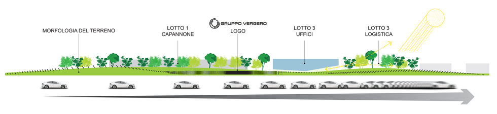 Carefully sculpturing the berm formation with different high and low points that contain some of the interior operations while revealing the office building to sight, the design proposes a new image for the productive landscape of the Gruppo Vergero headquarters which through its linearity and dynamism is best perceived in motion.